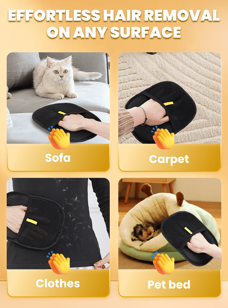 Show how easily the glove picks up pet hair from various surfaces (clothes, sofas, carpets).